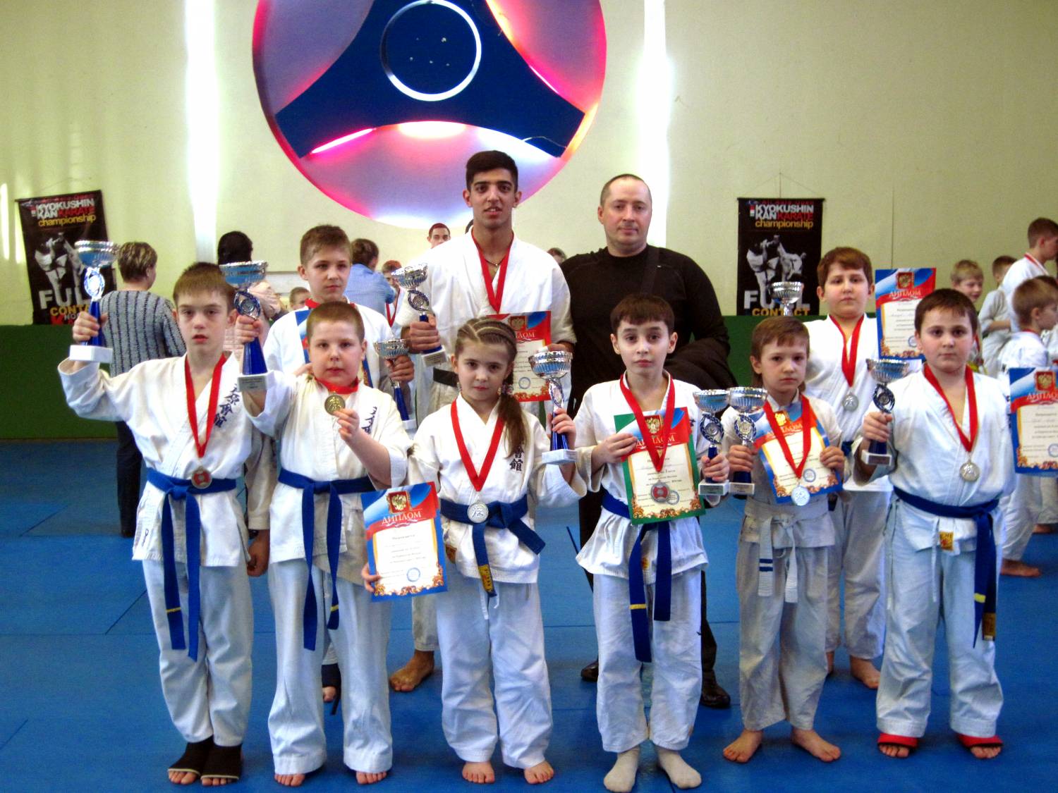 Есть медали и за ката, есть и за кумитэ. Синие пояса в основном у детей второго года обучения. Кроме того есть возрастное ограничение - на синий пояс может претендовать ребенок 8-ми лет.