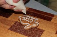 Ну вот сколько я делала пряников , из данного количества получается достаточно много глазури. поэтому, если Вы делаете первый раз, попробуйте взять половину от нормы ( Меньше уйдёт сахарной пудры) Яичный белок немного взбить вилкой. Затем небольшими порциями вводим просеянную сахарную пудру и тчательно растираем или взбиваем венчиком. Ближе к концу, добавить лимонный сок. Если Вы хотите заливать глазурью пряник, то есть полностью его покрыть, тогда глазурь должна быть менее густая. На один белок хватит 6 ст. л. сахарной пудры Для росписи и нанесения узора на пряник, нужна глазурь, которая не будет растекаться. Поэтому смело добавляем сахарную пудру. Думаю многие из Вас скажут:" Что париться, взбить всё миксером и готово!". Я пробовала. При взбивании миксером, глазурь действительно становится однородной , но сильно насыщается кислородом. И после высыхания на прянике становится очень ломкой , хрупкой. и начинает крошится. Чтобы нанести тонкий узор на пряник. Я взяла обыкновенный полиэтиленовый мешок, положила в него глазурь и маленькими ножничками отрезала уголочек. Ну и начинаем рисовать! Незабываем подключать к этому увлекательному делу своих детей!)