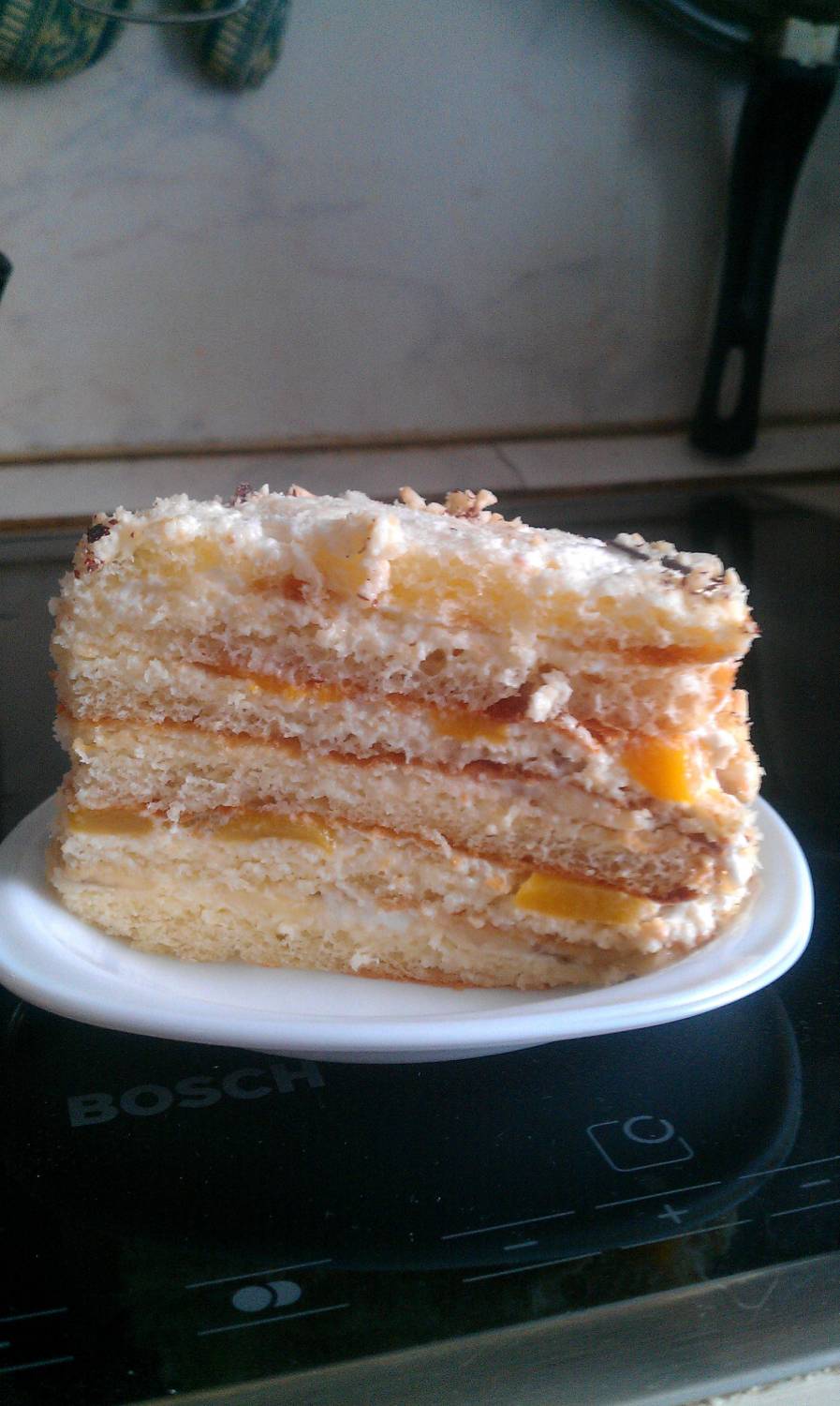 Собрать тортик, корж-крем-банан+персик-корж-крем и т.д.