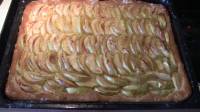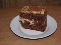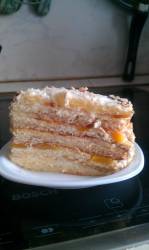 Вылить на противень, застеленный пекарской бумагой. Испечь корж при температуре 200 градусов (минут 20-25 получается). Остывший корж разрезать на две части ( у меня прямоугольный противень, получился прямоугольный тортик)